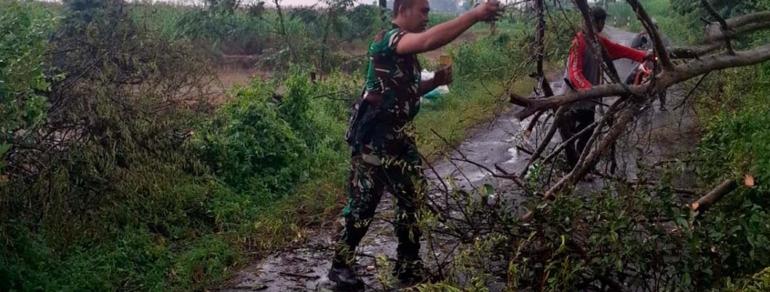 Babinsa Koramil Tambakboyo Bersama Warga Gotong Royong Bersihkan Akses Jalan Tertutup Pohon Tumbang