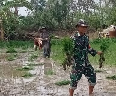 Gresik,– Dalam upaya mendukung program swasembada pangan, anggota Koramil Ujungpangkah, Serda Sulis, turun langsung ke sawah membantu petani menanam padi di Desa Karangrejo, Kecamatan Ujungpangkah, Kabupaten Gresik. Kegiatan ini bertujuan untuk meningkatkan hasil pertanian dan memotivasi petani binaan agar lebih semangat dalam bercocok tanam.