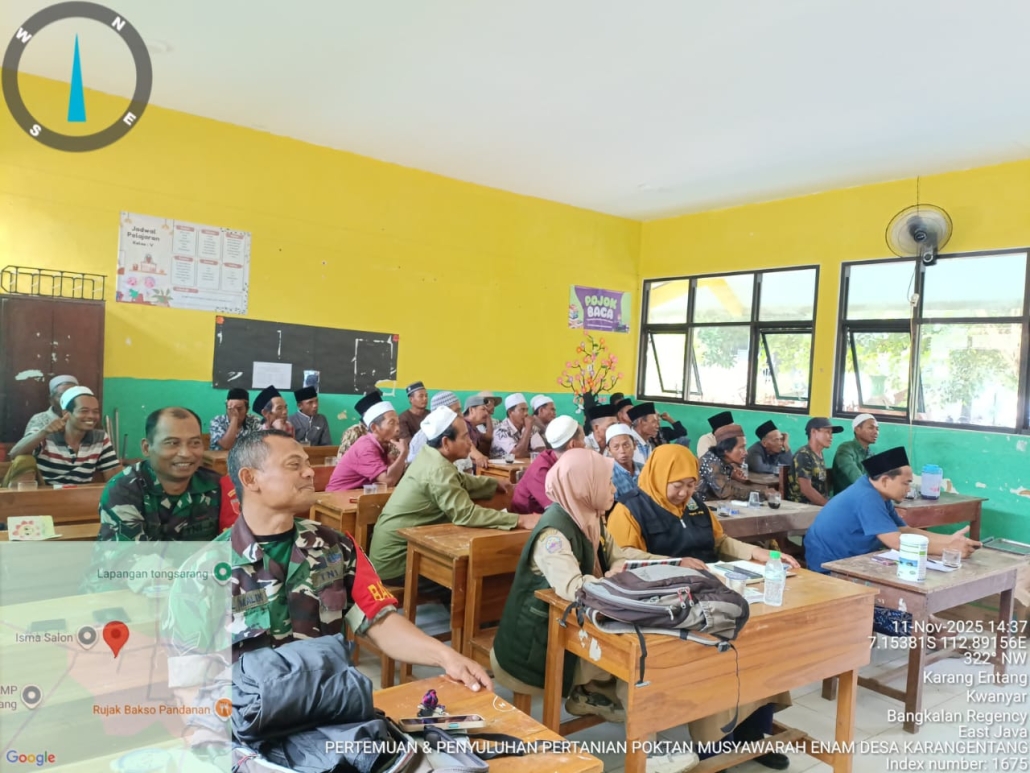 BANGKALAN — Babinsa Koramil 0829-05/Kwanyar, Serka Tri Elok, bersama satu anggota Babinsa, petugas penyuluh pertanian, dan Mantri Tani Kecamatan Kwanyar melaksanakan pendampingan musyawarah budidaya tanaman pangan dan hortikultura di Desa Karang Entang pada Selasa (11/11/2025). Kegiatan ini menjadi langkah strategis memperkuat pengetahuan teknis petani.