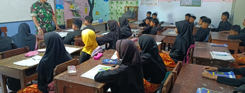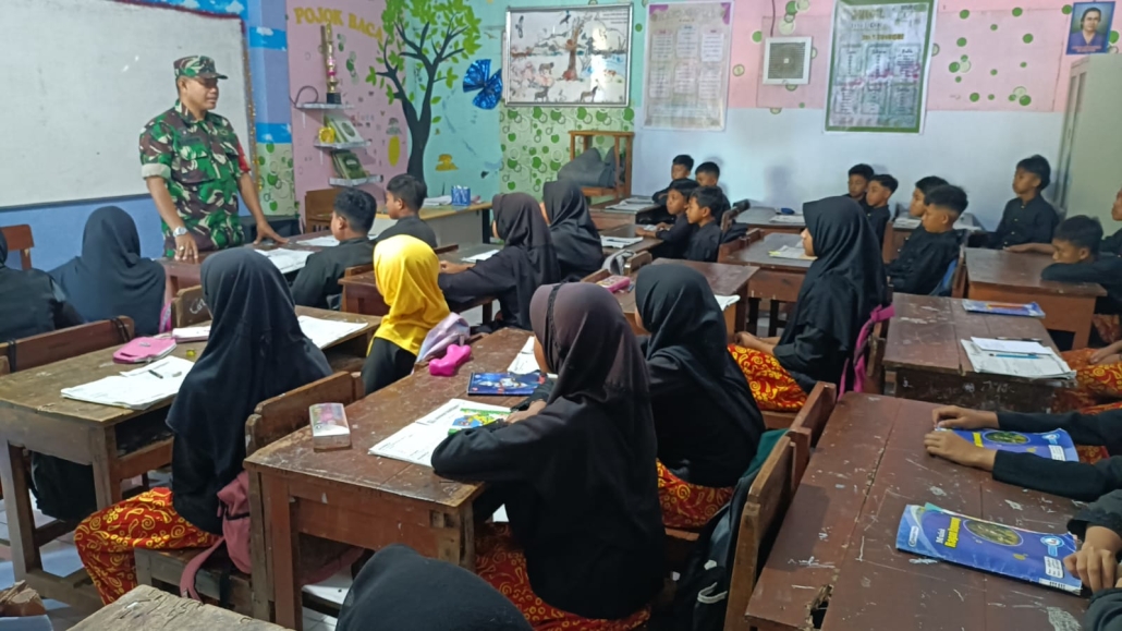 Babinsa menjelaskan pentingnya disiplin sejak dini, mulai dari datang tepat waktu, berpakaian rapi, menghormati guru, hingga menjaga sikap terhadap sesama teman.