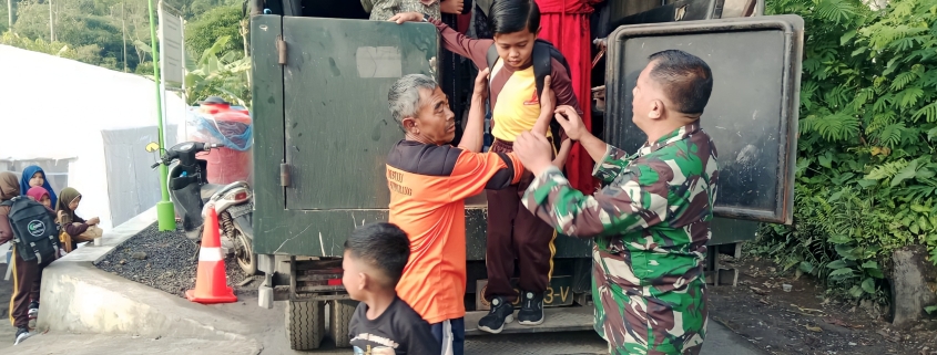 LUMAJANG — Upaya menjaga keberlanjutan pendidikan pasca erupsi Semeru terus dilakukan jajaran Kodim 0821/Lumajang. Sertu Biardi melaksanakan pendampingan pengantaran siswa dari lokasi pengungsian menuju SDN 02 Supiturang sebagai langkah memastikan proses belajar tetap berjalan aman dan tertib.