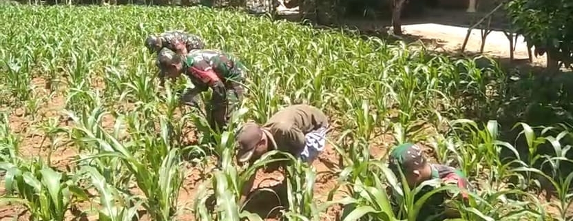 PAMEKASAN – Dalam rangka mendukung program ketahanan pangan nasional, anggota Posramil 0826-12 Kadur terus menunjukkan komitmennya dalam membantu petani di wilayah binaannya. Salah satunya seperti yang dilakukan oleh Babinsa Desa Pamoroh, Serda Anis Daeng dan rekannya yang terjun langsung ke lahan pertanian membantu petani membersihkan rumput liar di sekitar tanaman jagung.