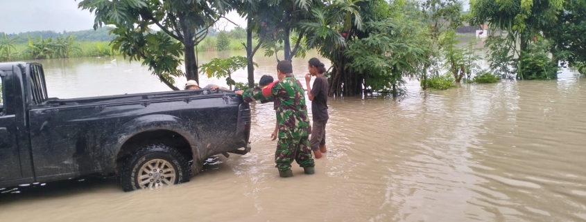 Babinsa Posramil Pitu Evakuasi Warga Terdampak Banjir di Ngawi Secara Cepat
