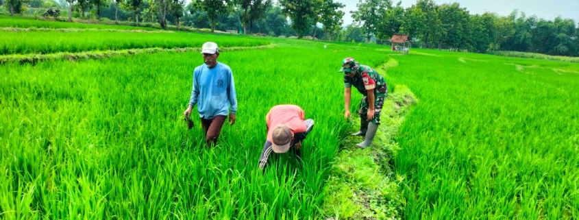 Babinsa Prambon Bantu Petani Bersihkan Rumput Liar Agar Tanaman Padi Tumbuh Optimal