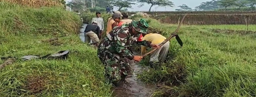 BLITAR — Babinsa Desa Boro Koramil 0808/21 Selorejo, Sertu Yudha Irawanto, bersama petani melaksanakan pembersihan saluran irigasi sawah di Dusun Ngaglik, Desa Ngreco, Kecamatan Selorejo, Kabupaten Blitar, sebagai upaya menjaga kelancaran pengairan pertanian wilayah binaan.