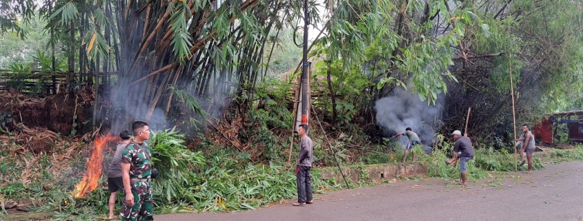 Babinsa bersama warga bergerak sigap memotong dan menyingkirkan ranting bambu yang menutup jalan agar akses kembali aman dilalui. Kolaborasi masyarakat dan aparat kewilayahan menjadi kunci utama dalam menangani hambatan mendadak yang muncul akibat cuaca ekstrem yang melanda daerah tersebut.