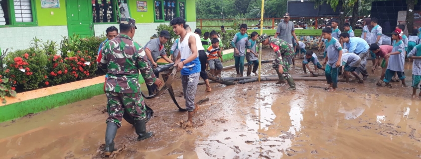 Para personil babinsa bahu membahu gotong royong untuk membantu para guru siswa siswi guna membersihkan sisa lumpur akibat dari banjir, Sertu Maryono sebagai babinsa desa Bareng menjelaskan, bahwa kegiatan pembersihan ini merupakan bentuk kepedulian TNI kepada warga yang terdampak banjir, Kegiatan ini akan terus berlanjut hingga semua fasilitas umum yang terdampak banjir benar-benar bersih,” pungkasnya.