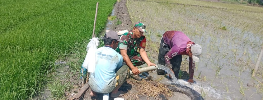 Gresik,– Babinsa Koramil 0817/02 Wringinanom Kodim Gresik, Serka Aan Hendrawan, bersama para petani melaksanakan kegiatan pengairan sawah melalui pompanisasi di Desa Lebaniwaras, Kecamatan Wringinanom, Kabupaten Gresik.