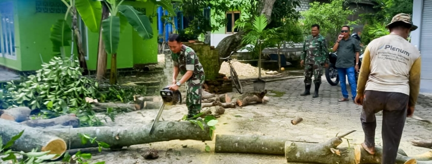 BOJONEGORO, – Beberapa personel Babinsa Koramil 10/Kanor, Kodim 0813 Bojonegoro diturunkan untuk membantu mengevakuasi pohon roboh yang menimpa rumah milik Hafidz (60) warga Dusun Dondong RT.001/RW.002 Desa Gedongarum Kecamatan Kanor Kabupaten Bojonegoro pasca hujan deras disertai angin kencang.