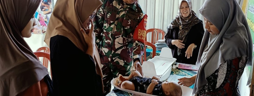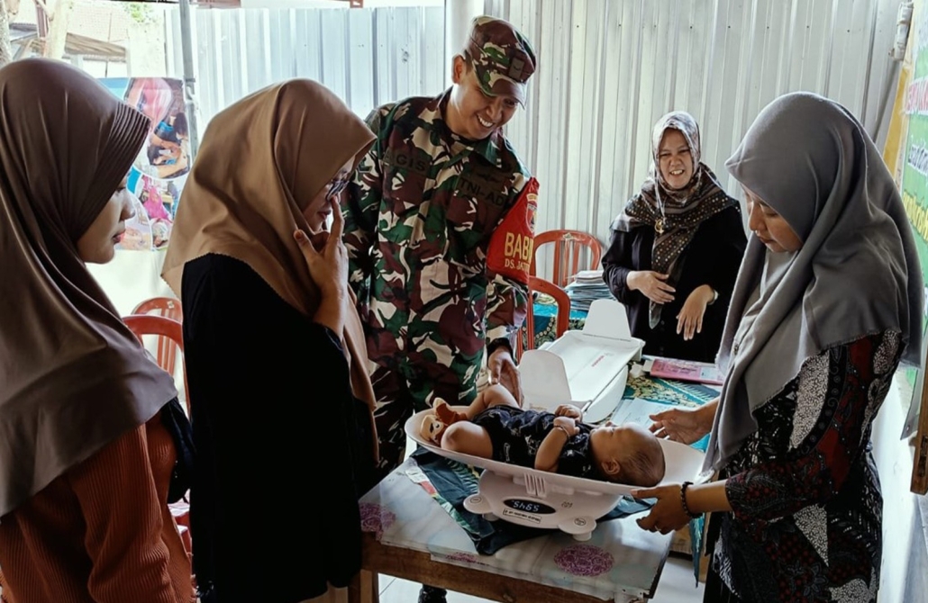 Kegiatan kali ini babinsa melaksanakan pendamping kepada tenaga kesehatan dan kader Posyandu dengan sasaran penimbangan berat badan, mengukur tinggi badan untuk mengetahui perkembangan dan pertumbuhan bayi serta pemberian vitamin kepada Balita untuk mencegah Stunting.
