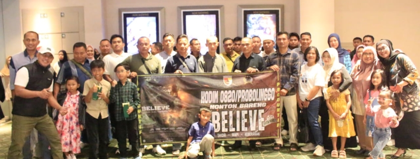 Probolinggo,- Komandan Kodim (Dandim) 0820/Probolinggo Letkol Arh Iwan Hermaya bersama para tokoh dari berbagai lapisan masyarakat yang ada di wilayah teritorialnya nonton bareng (Nobar) tayangan trailers film “Believe : Takdir, Mimpi, Keberanian”, Sabtu (5/7).