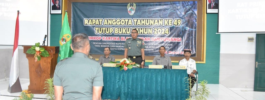 BANYUWANGI – Hari ini Jumat, (07-03-2024) Kodim 0825/Banyuwangi laksanakan Rapat Anggota Tahunan Ke-49 Tutup Buku Tahun 2024 Primkop Kartika Blambangan Banyuwangi dilaksanakan di aula Panglima Sudirman Makodim 0825/Banyuwangi jalan RA Kartini Nomor 02 Kepatihan Kabupaten Banyuwangi.
