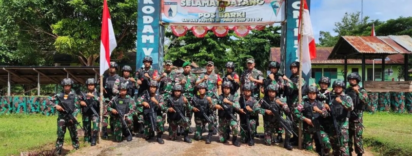 Merauke,- Prajurit TNI dari Satgas Yonif 511/DY mendapat kunjungan kerja dari Dankolakops rem 174/ATW Brigjen TNI Agus Widodo, S.I.P., M.Si., didampingi oleh Kasiops Korem 174/ATW dan Dandim 1707/Merauke dalam rangka meninjau dan melihat langsung kondisi pos satgas serta juga memberikan arahan dan motivasi kepada prajurit Badak Hitam di Kabupaten Merauke, Papua Selatan, Jumat (05/05/2023).