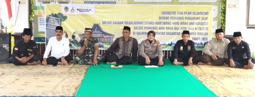 Madiun – Danramil 0803-14/Dagangan, Kapten Inf Muslikin, menghadiri pertemuan Sinergitas Tiga Pilar dengan para pengurus perguruan silat setempat. Kegiatan yang berlangsung di Pendopo Kantor Kecamatan Dagangan pada Kamis (27/3), tersebut bertujuan untuk mewujudkan situasi keamanan dan ketertiban masyarakat (Kamtibmas) yang aman dan kondusif menjelang dan selama perayaan Hari Raya Idul Fitri 1446 H/2025 M di wilayah Kecamatan Dagangan. Pertemuan ini dihadiri oleh unsur TNI, Polri, pemerintah kecamatan, serta perwakilan dari berbagai perguruan silat yang ada di wilayah Kecamatan Dagangan.