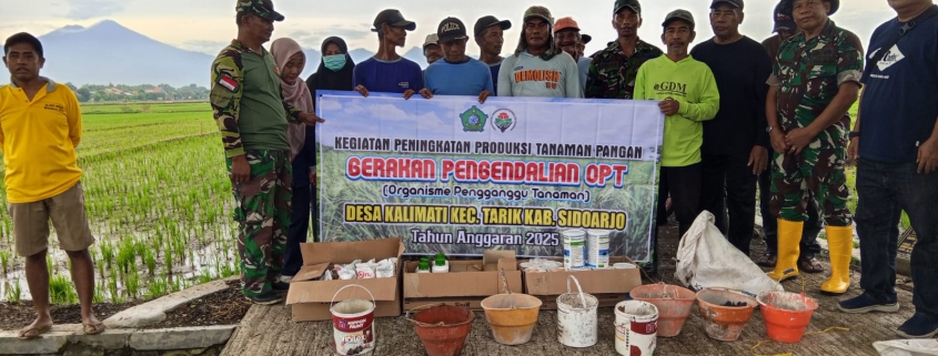 Sidoarjo,- Dalam mensukseskan program Pemerintah guna meningkatkan ketahanan pangan, Danramil 0816/11 Tarik Lettu Inf Yahman beserta anggota melaksanakan pendampingan Kelompok Tani Sumber Bahagia warga masyarakat Desa Kalimati Kec Tarik Kab. Sidoarjo dalam rangka pengendalian OPT (Organisme Pengganggu Tanaman) terutama tanaman padi.