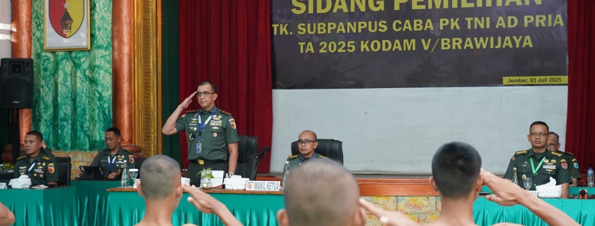 Jember,- Pangdam V/Brawijaya, Mayjen TNI Rudy Saladin, M.A, memimpin berlangsungnya siding pantukhir pusat penerimaan Secaba PK TNI-AD tahun 2025 di Rindam V/Brawijaya Jember. Kamis (03/07/2025).