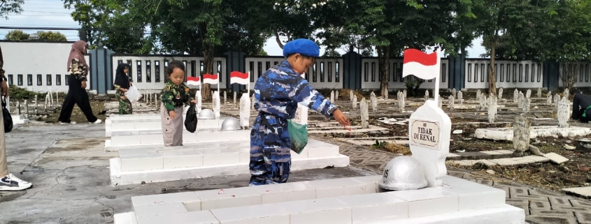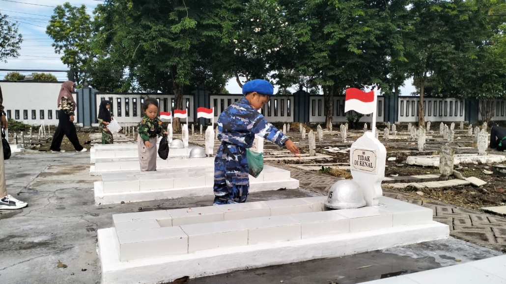 Dengan mengenakan pakaian TNI yang melambangkan Pahlawan masa kini, para siswa Taman Kanak-Kanak dengan khidmad bersama-sama dipimpin oleh Serka (k) Nita Yusmita serta para Guru dan Bapak Suwito penjaga makan, memanjatkan doa untuk para pahlawan di Taman Makam Pahlawan Kusuma Negara Kabupaten Lamongan.