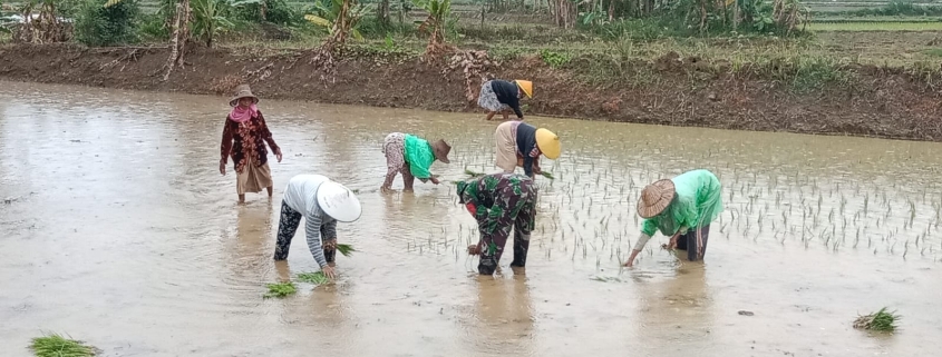 PAMEKASAN,- Babinsa Desa Bandaran, Koramil 0826-02 Tlanakan, Sertu Moh. Masli, bersama warga Desa Bandaran melaksanakan kegiatan gotong-royong menanam padi pada lahan seluas seperempat hektar milik Sunari, warga Dusun Nangger, Desa Bandaran, Kecamatan Tlanakan, Kabupaten Pamekasan.