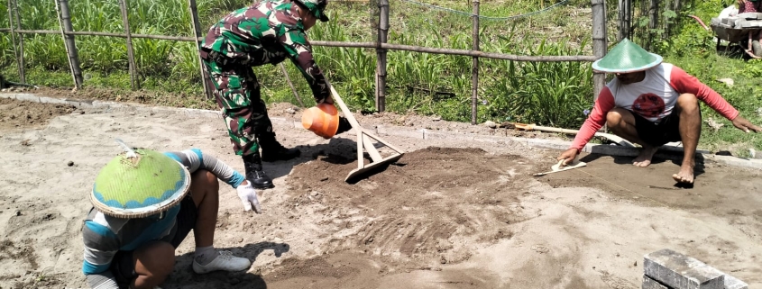 Madiun, – Babinsa Desa Kedungrejo Koramil 0803-03/Balerejo Serda Sopyan bersama warga setempat melaksanakan kegiatan gotong royong dalam perbaikan infrastruktur jalan desa melalui pemasangan paving blok, pada hari Minggu (11/5). Kegiatan ini bertujuan untuk meningkatkan kualitas jalan dan memperlancar aktivitas masyarakat sehari-hari.