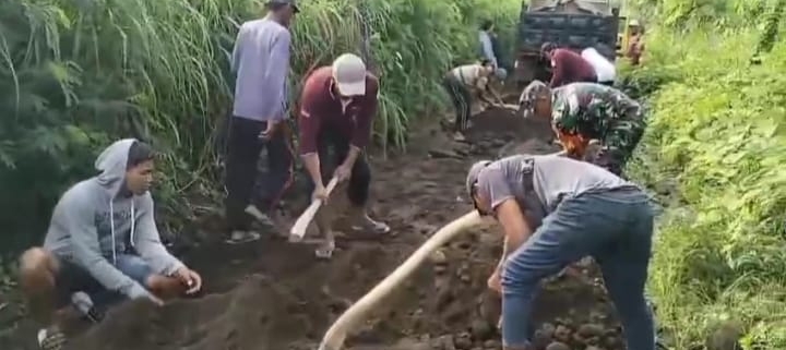 Situbondo,– Dalam semangat kebersamaan dan gotong royong, Babinsa Koramil 0823-08/Banyuputih Serma Sudaryono bersama warga Dusun Karangrejo, Desa Sumberejo, Kecamatan Banyuputih, kabupaten Situbondo melaksanakan kerja bakti memperbaiki jalan