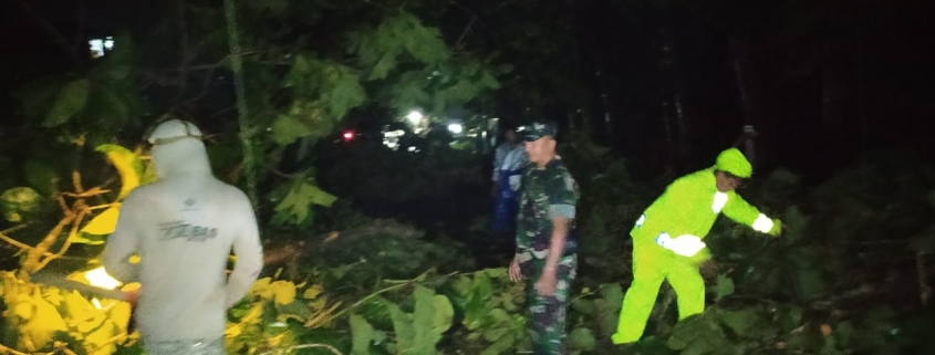 Begitu menerima laporan dari warga, piket dari masing masing koramil langsung menuju lokasi kejadian bersama tim relawan dan warga setempat. Dengan menggunakan alat seadanya, mereka mulai memotong cabang-cabang pohon yang menutup jalan dan membersihkan ranting serta batang pohon yang jatuh.