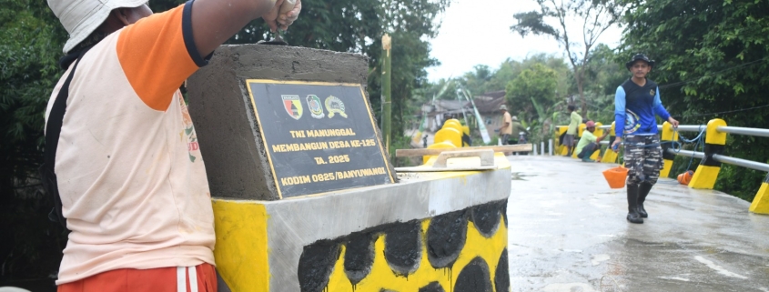 BANYUWANGI – Anggota TNI yang tergabung dalam TNI Manunggal Membangun Desa (TMMD) telah menyelesaikan pengerjaan jembatan di Desa Silirsari dengan tahapan akhir berupa pengecatan dan pemasangan plang serta gapura.