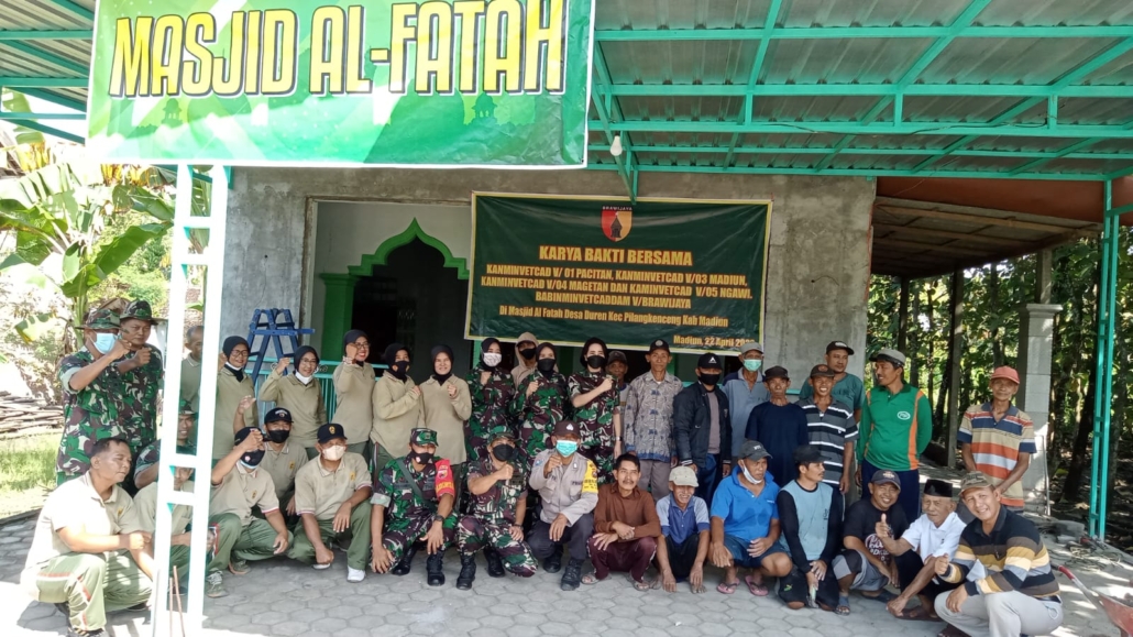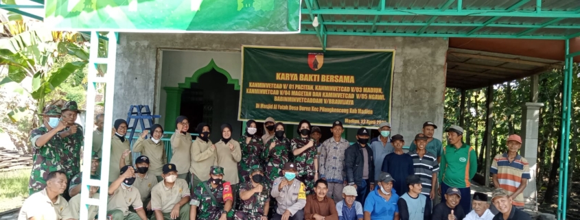 Madiun – Jajaran Kantor Administrasi Veteran/Kanminvet Korem 081/Dsj antara lain Minvet 01 Pacitan, Minvet 03 Madiun, Minvet 04 Magetan, Minvet 05 Ngawi bersama anggota TNI/ PNS, Masyarakat, Babinsa Koramil 0803/10 Pilangkenceng dan Babinkamtib Desa Duren melaksanakan Karya Bakti bersama di Masjid Al Fatah Ds.Duren Kec.Pilangkenceng Kab. Madiun. Jum’at, 22 April 2022.