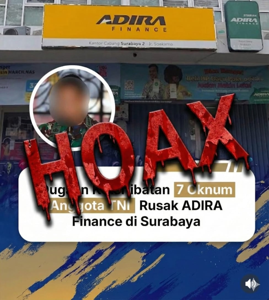 Surabaya,- Beberapa hari terakhir beredar informasi di media sosial dan sejumlah platform pesan instan mengenai dugaan pengerusakan Kantor ADIRA Finance Cabang Surabaya oleh 7 oknum anggota TNI. Informasi tersebut dengan tegas dinyatakan tidak benar oleh pihak TNI maupun ADIRA Finance. Senin (01/12/2025)