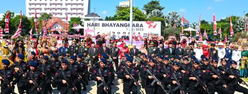 Surabaya,- Upacara peringatan HUT Bhayangkara ke-77 yang digelar di Gedung Negara Grahadi, Kota Surabaya. Sabtu (01/07/2023) pagi, diwarnai dengan adanya pemberian penghargaan Tan Hana Dharma Mangrwa dari Kapolda Jatim kepada Pangdam V/Brawijaya, Mayjen TNI Farid Makruf, M. A.