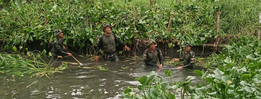 Setelah apel, seluruh peserta yang terdiri dari anggota Koramil 0816/16 Waru, Polsek Waru, perangkat desa, dan masyarakat sekitar bahu-membahu membersihkan enceng gondok yang menyumbat aliran sungai. Dengan semangat gotong royong, aliran Sungai Cantel sepanjang Desa Tambaksawah kini terlihat lebih bersih dan rapi.