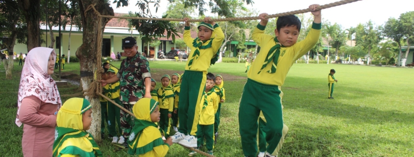 Tidak berhenti di situ, latihan baris-berbaris juga menjadi momen menarik bagi anak-anak. Dengan penuh semangat, mereka belajar bagaimana berdiri tegak, berjalan beriringan, dan mengikuti aba-aba dengan disiplin. Semua ini dilakukan dalam suasana yang menyenangkan dan penuh keceriaan, berkat bimbingan penuh kesabaran dari Pelda Komarul Huda dan Serma Suwoto.
