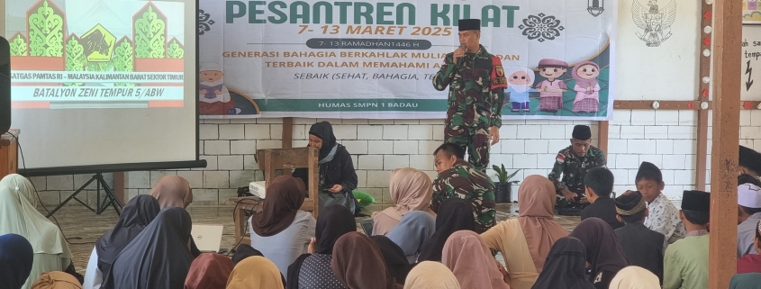 Kapuas Hulu,- Dalam menyemarakkan suasana Ramadhan, Satgas Pamtas RI-Malaysia Yonzipur 5/ABW menghadiri kegiatan Pesantren Kilat tingkat SMPN1Badau dengan membawa materi “Menyikapi Kegagalan dalam menggapai cita-cita” di SMP Negeri 1 Badau, Kecamatan Badau, Kabupaten Kapuas hulu, Minggu (9/3/2025).