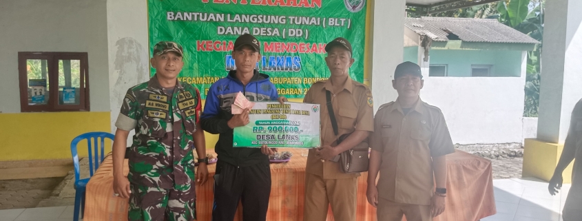 Bondowoso, 8 Juli 2025 – Komitmen TNI dalam memastikan bantuan sosial tepat sasaran kembali dibuktikan melalui kehadiran Babinsa Desa Lanas, Sertu M. Gatot Wibowo, yang melakukan pendampingan aktif dalam kegiatan penyaluran Bantuan Langsung Tunai Dana Desa (BLT DD) Triwulan II Tahun Anggaran 2025.Kegiatan yang berlangsung di Balai Desa Lanas, Kecamatan Botolinggo, ini menyasar 34 Keluarga Penerima Manfaat dengan masing-masing menerima bantuan sebesar Rp 900.000.