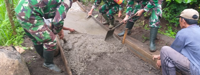 Situbondo – Dalam upaya meningkatkan akses transportasi masyarakat, anggota Koramil 0823/14 Jatibanteng bersama perangkat desa dan masyarakat melaksanakan kerja bakti pengecoran jalan di Dusun Potok, Desa Pategalan, Kecamatan Jatibanteng, Kabupaten Situbondo, Sabtu (14/12/2024).