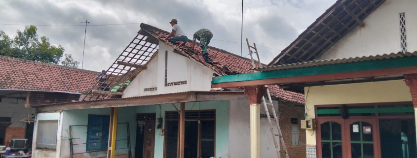 Dengan penuh semangat TNI-Polri bersama warga masyarakat membersihkan material atap rumah seperti genteng, seng/spandek.