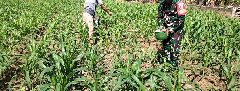 PAMEKASAN – Dalam upaya mendukung ketahanan pangan dan meningkatkan produktivitas pertanian warga, Babinsa Desa Tentenan Timur Seru Moh. Saleh turut membantu proses pemupukan tanaman jagung milik Sahid, petani asal Dusun Timur, Desa Tentenan Timur, Kecamatan Larangan, Kabupaten Pamekasan.