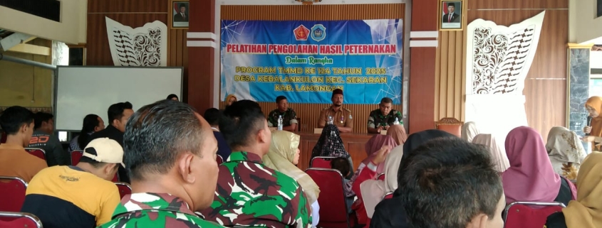 Lamongan,- Kodim 0812/Lamongan dan Dinas Peternakan Kabupaten Lamongan menggelar pelatihan pengolahan hasil peternakan dalam rangka TMMD (TNI Manunggal Membangun Desa) Ke-124 di Balai Desa Kebalankulon, Kecamatan Sekaran, Kabupaten Lamongan.