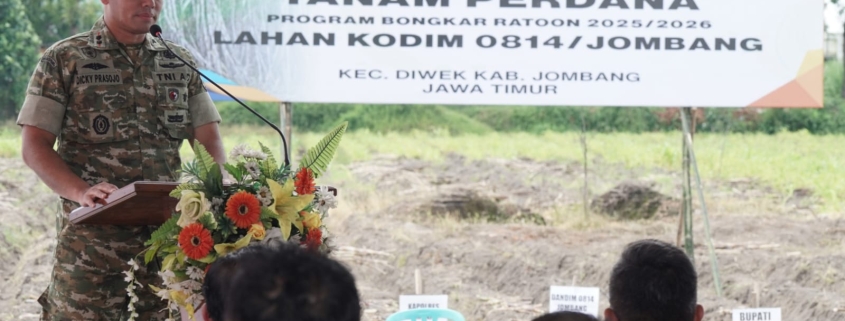 JOMBANG – Kodim 0814/Jombang melaksanakan Tanam Perdana Program Bongkar Ratoon Tahun 2025/2026 di lahan milik Kodim 0814/Jombang, Jalan Raya Diwek, Desa Ceweng, Kecamatan Diwek, Kabupaten Jombang. Kegiatan ini menjadi wujud nyata dukungan TNI AD terhadap ketahanan pangan dan swasembada gula nasional, Sabtu (3/1/2026).
