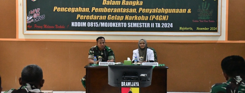 Mojokerto,— Dandim 0815/Mojokerto Letkol Inf Rully Noriza, S.I.P., M.I.P., membuka kegiatan penyuluhan tentang Pencegahan, Pemberantasan, Penyalahgunaan, dan Peredaran Gelap Narkoba (P4GN) di Makodim 0815, Rabu (13/11/2024). Kegiatan ini merupakan langkah strategis untuk memerangi narkoba.