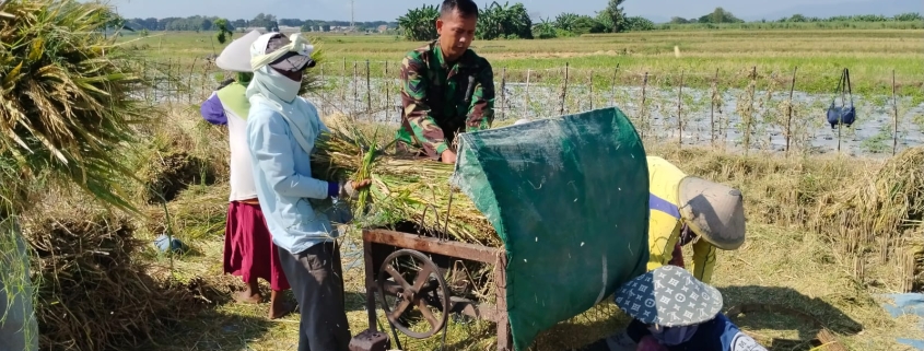 Probolinggo, Dalam rangka mendukung Gerakan Antisipasi Darurat Pangan Nasional, Babinsa Koramil 0820-05/Tongas, Sertu Sodikin, melakukan pendampingan langsung dalam kegiatan panen padi milik warga binaannya, Bapak Soleh, di Dusun Merico, RT 12 RW 10, Desa Tanjung Rejo, Kecamatan Tongas, Kabupaten Probolinggo,(7/6).