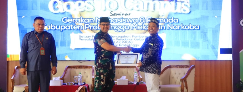 Kegiatan bertajuk “P4GN Goes To Campus: Gerakan Organisasi Mahasiswa dan Pemuda Kabupaten Probolinggo Melawan Narkoba” ini diikuti sekitar 1000 mahasiswa dan pemuda. Hadir sebagai narasumber Dandim 0820/Probolinggo, Letkol Arh Iwan Hermaya, P., S.I.P., M.I.P., bersama Forkopimda Kabupaten Probolinggo.