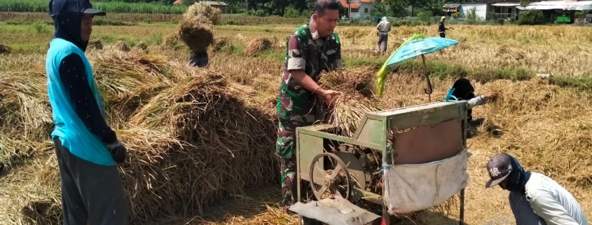 Probolinggo, Dalam rangka mendukung program Gerakan Antisipasi Darurat Pangan Nasional, Kodim 0820/Probolinggo melalui jajaran Koramil terus aktif mendampingi para petani di wilayah binaan. Salah satu aksi nyata terlihat dari kegiatan yang dilakukan oleh Sertu Asworo, Babinsa Desa Banyuanyar Kidul, yang turut membantu panen padi milik warga di Dusun Kedung, Kecamatan Banyuanyar,(6/7).