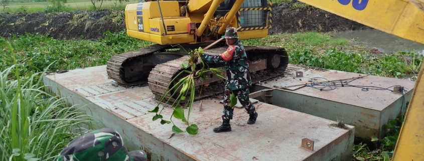 Anggota Koramil 0816/03 Buduran bersama masyarakat setempat bahu – membahu membersihkan dan mengangkat eceng gondok yang banyak di sungai, guna kelancaran aliran air yang berguna untuk mengaliri persawahan sesuai dengan program pemerintah yaitu ketahanan pangan.