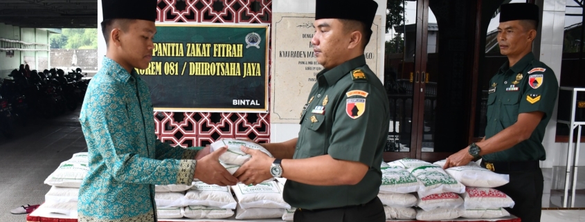 Madiun, – Zakat fitrah hukumnya wajib bagi umat Islam dan dibayarkan pada bulan Ramadan hingga paling lambat sebelum pelaksanaan Salat Idul Fitri. Pada Ramadan 1446 H kali ini, seperti tahun-tahun sebelumnya, Korem 081/DSJ juga kembali menyalurkan zakat fitrah yang diterima dari anggota dan keluarganya.