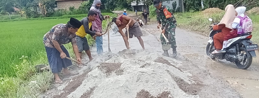 Masyarakat Bersama Koramil Geger Laksanakan Swadaya Perbaikan Jalan di Bangkalan