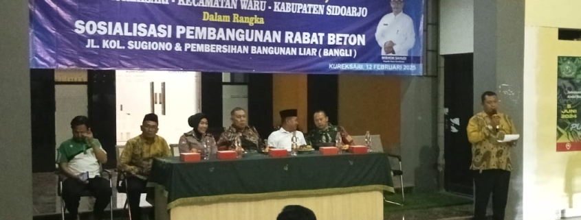 Sidoarjo,- bertempat di Pendopo Balai Desa Kureksari, Kecamatan Waru, telah dilaksanakan Musyawarah Desa (Musdes) dalam rangka sosialisasi pembangunan beton rabat dan pembersihan bangunan liar di Jalan Kolonel Sugiono, Desa Kureksari. Kegiatan ini dihadiri oleh berbagai tokoh penting serta perangkat desa yang turut mendukung pembangunan yang akan meningkatkan kualitas infrastruktur di desa setempat.