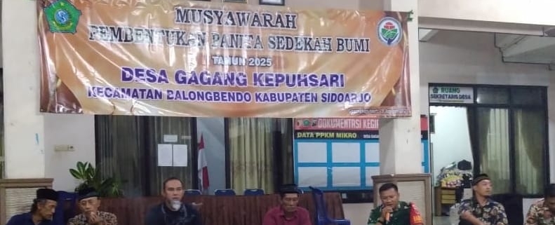 Sidoarjo, Babinsa Koramil 0816/10 Balongbendo, Peltu Hadi Susilo, turut menghadiri kegiatan Musyawarah Desa Pembentukan Panitia Sedekah Bumi yang diselenggarakan di Balai Desa Gagangkepuhsari, Kecamatan Balongbendo, Kabupaten Sidoarjo. Acara ini dihadiri sekitar 60 peserta yang terdiri dari berbagai elemen masyarakat, termasuk perangkat desa, tokoh masyarakat, serta perwakilan organisasi lokal.