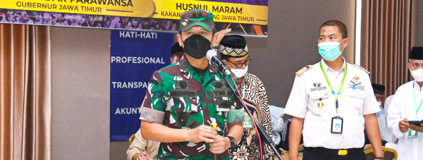 Surabaya – Pangdam V/Brawijaya Mayjen TNI Nurchahyanto M.Sc, menyambut kedatangan ratusan jemaah haji kloter tiga bertempat di Gedung Asrama Haji Jalan Manyar Kertoadi No.1 Klampis Ngasem, Kecamatan Sukolilo, Surabaya, Senin, (18/7/2022).
