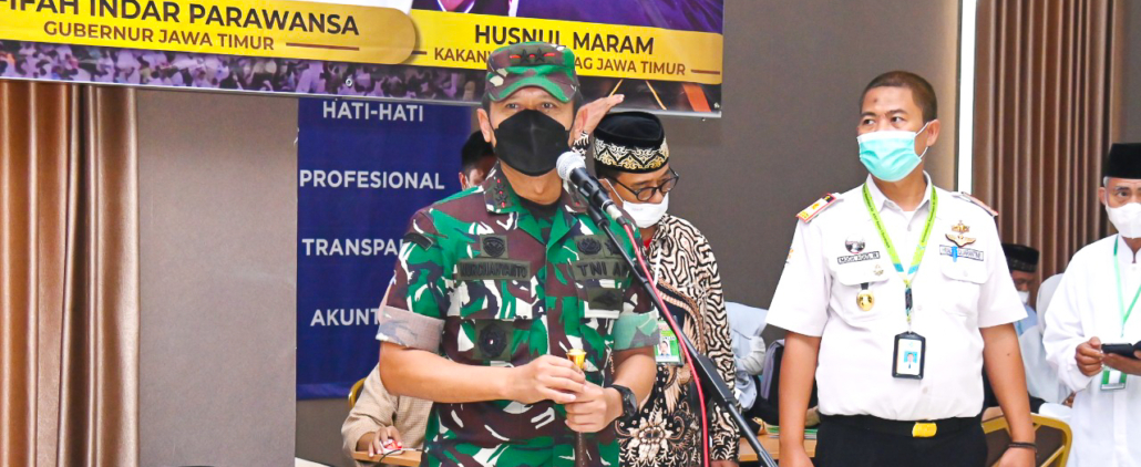 Surabaya – Pangdam V/Brawijaya Mayjen TNI Nurchahyanto M.Sc, menyambut kedatangan ratusan jemaah haji kloter tiga bertempat di Gedung Asrama Haji Jalan Manyar Kertoadi No.1 Klampis Ngasem, Kecamatan Sukolilo, Surabaya, Senin, (18/7/2022).