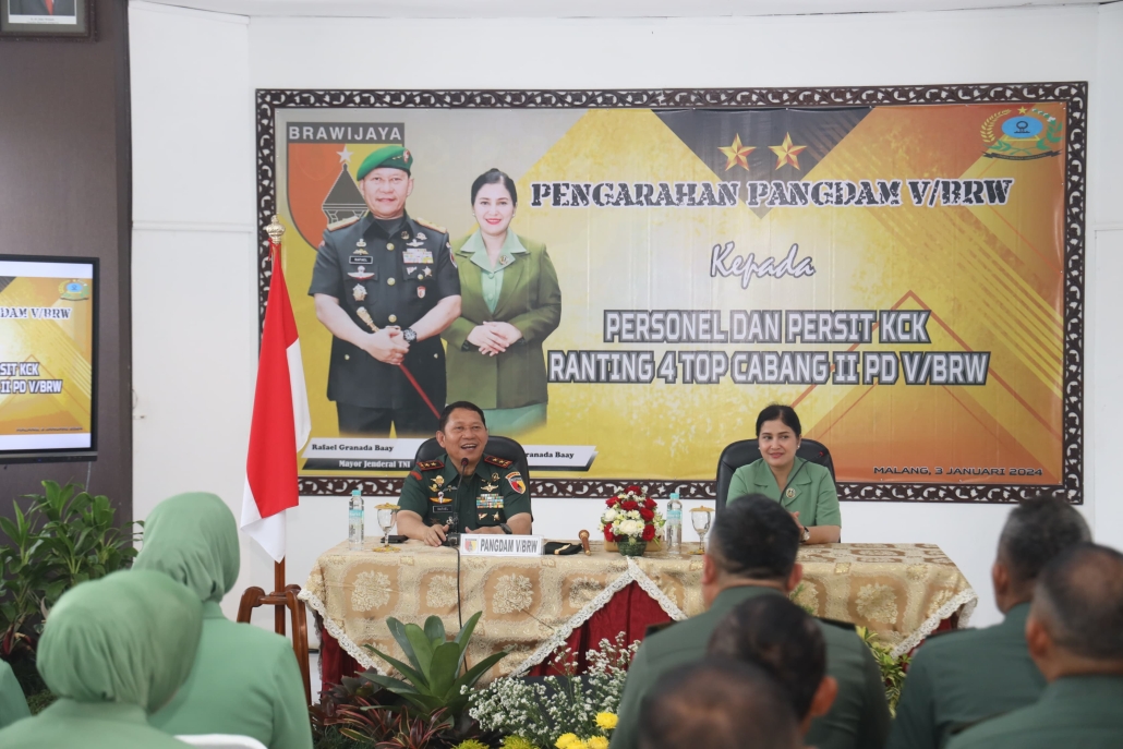 Malang, Pendam V | | Kunker pertama ke Korem 083/BJ, kemudian ke Topdam, Bintaldam serta Ajendam V/Brw. Pangdam memberikan Pengarahan Kepada seluruh prajurit dan Ibu Persit yang ada di wilayah Malang Raya.